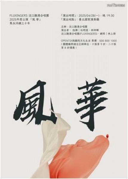 【台北】Fluxingers淡江聽濤合唱團2025年度公演「風.華」-雋永淬鍊三十年 地點:國家兩廳院演奏廳 日期:2025-04-28 網址:http://yii.tw/events/37436