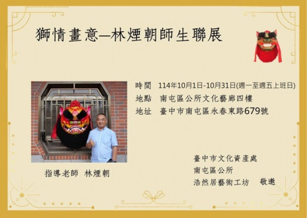 【台中】林煙朝獅情畫意師生聯展 地點:南屯區(臺中市)= 日期:2025-10-01 ~ 2025-10-31 網址:http://yii.tw/events/41245