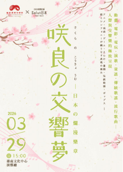 【台南】2026臺南國際音樂節 咲良の交響夢─日本の爛漫樂章 地點:臺南文化中心演藝廳 日期:2026-03-29 網址:http://yii.tw/events/43778