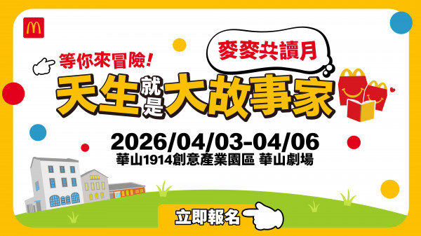 【台北】【2026麥麥共讀月】天生就是大故事家|兒童節親子活動 地點:華山文創園區 日期:2026-04-03 ~ 2026-04-06 網址:http://yii.tw/events/43885